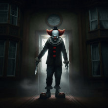 As they backed away from the table, a figure emerged from the shadows. It was a clown, grotesque and unsettling. Its painted smile was stretched into a nightmarish grin, its eyes two black pits in its chalk-white face. It moved with an unnatural jerkiness, its oversized shoes squeaking with every step.